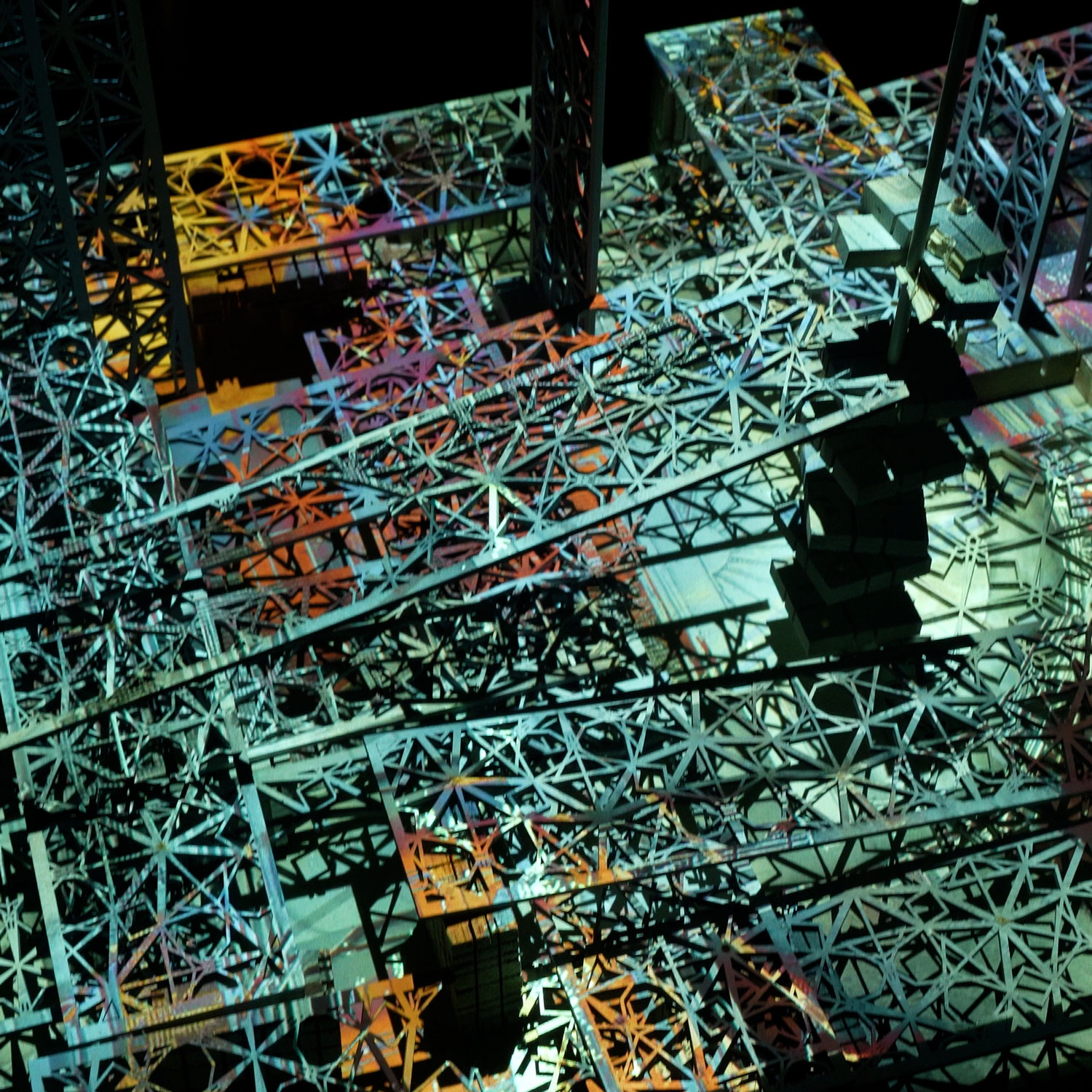 Videotisch 2: Beton auf Holzplatte, Stoff, Gewindestange, Videoprojektion
